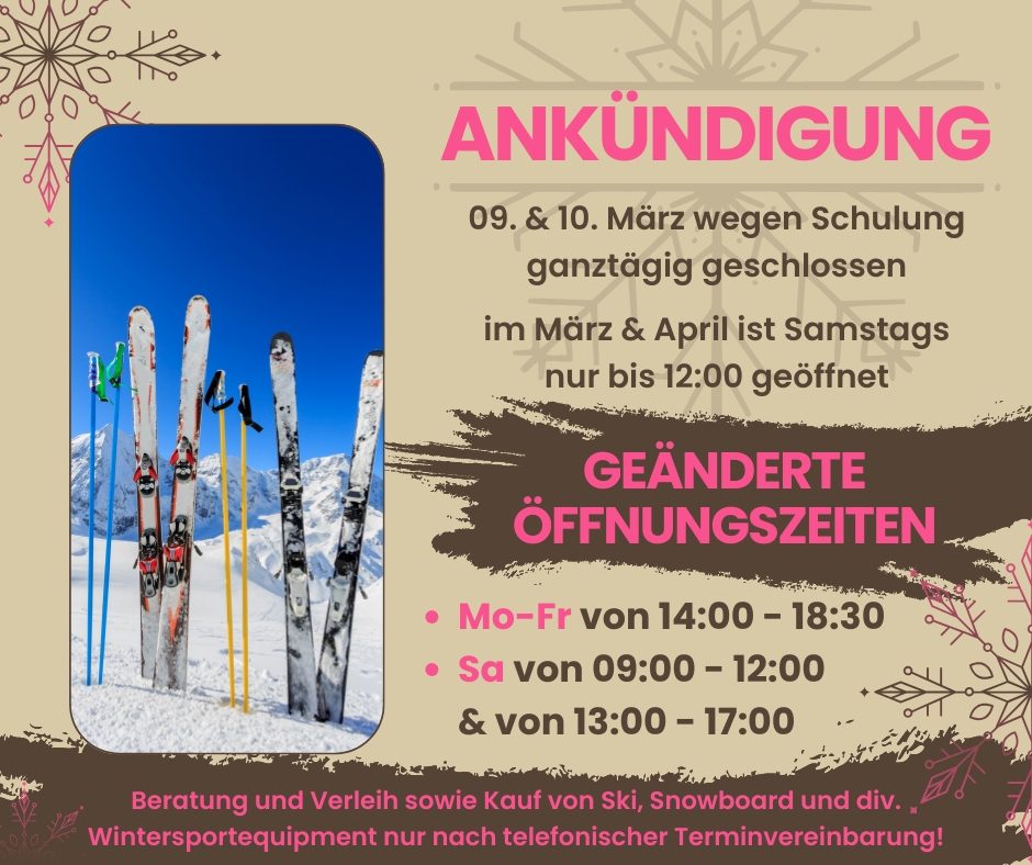 Beratung und Verleih sowie Kauf von Ski, Snowboard und div. Wintersportequipment nur nach telefonischer Terminvereinbarung!